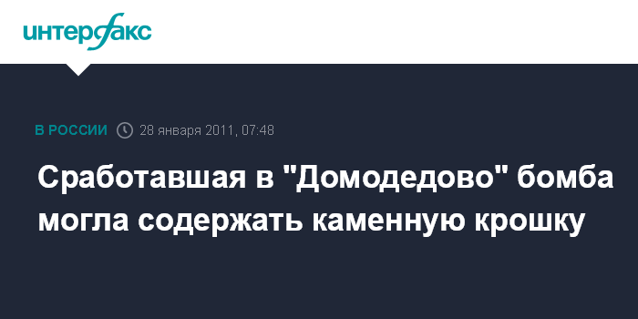 Москва. 28 января. INTERFAX.RU - При осуществлении теракта в аэропорту "Домодедово" террористами могло быть использовано взрывное устройство, ранее не применявшееся в России, сообщает в пятницу "Российская газета".