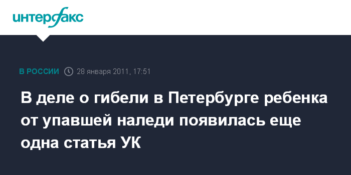Санкт-Петербург. 28 января. INTERFAX.RU - Главное следственное управление СК РФ по Петербургу возбудило еще одно уголовное дело в рамках расследования гибели шестилетнего ребенка от упавшей с крыши глыбы льда.