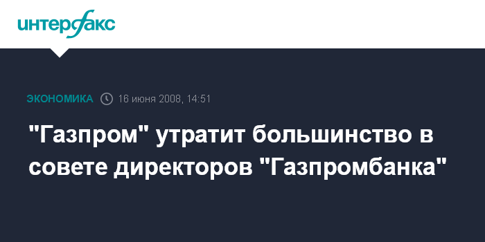Москва. 16 июня. ИНТЕРФАКС-АФИ - ОАО "Газпром" утратит большинство в совете директоров "Газпромбанка", претендуя только на пять из одиннадцати мест.