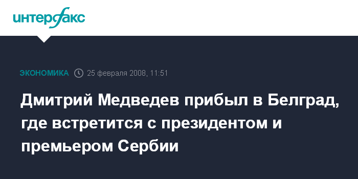 Белград. 25 февраля. INTERFAX.RU - Первый вице-премьер России Дмитрий Медведев прибыл в понедельник в Белград. Он проведет встречу с президентом Сербии Борисом Тадичем и премьер-министром республики Воиславом Коштуницей.