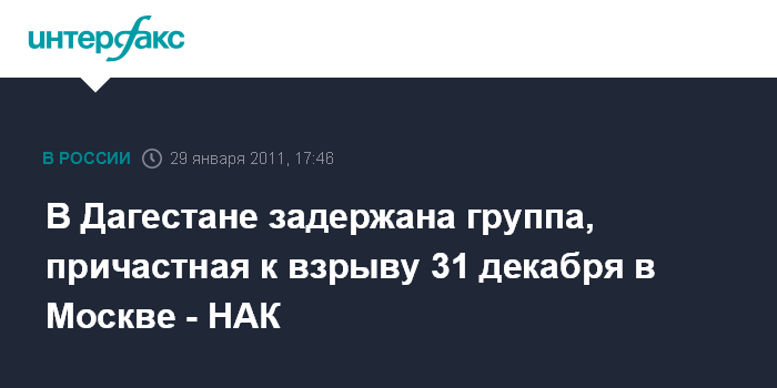 Москва. 29 января. INTERFAX.RU - Национальный антитеррористический комитет сообщает о задержании в Дагестане тех, кто был причастен к взрыву в Москве в канун Нового года. "29 января 2011 года в Республике Дагестан органами ФСБ России задержана группа лиц, причастных к взрыву на территории стрелкового клуба в Москве 31 декабря 2010 года", - говорится в сообщении информцентра НАК, поступившем в "Интерфакс".