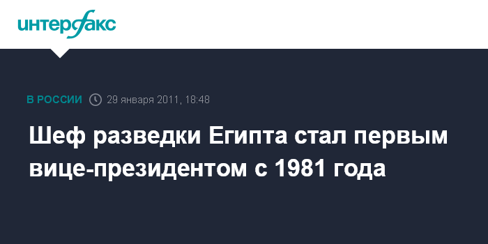 Лондон. 29 января. INTERFAX.RU - Глава разведки Египта Омар Сулейман назначен вице-президентом страны, сообщает Би-би-си. Пост вице-президента Египта был вакантным с 1981 года, после того, как был убит прежний президент страны Анвар Садат.