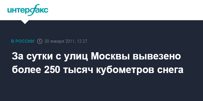 Москва. 30 января. INTERFAX.RU - С началом снегопада в ночь на воскресенье на улицы Москвы вышло необходимое количество снегоуборочной техники, сообщил "Интерфаксу" пресс-секретарь заместителя мэра по вопросам ЖКХ и благоустройства Игорь Пергаменщик. "Всего за сутки на снегосплавные пункты вывезено 252 тыс. кубометров снега", - сказал И.Пергаменщик.