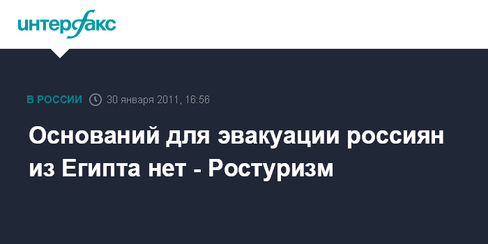 Москва. 30 января. INTERFAX.RU - В Ростуризме на данный момент не видят причин для эвакуации российских граждан из Египта. "Оснований для эвакуации российских туристов из Египта пока нет" - заявил в воскресенье "Интерфаксу" руководитель пресс-службы Ростуризма Олег Мосеев.