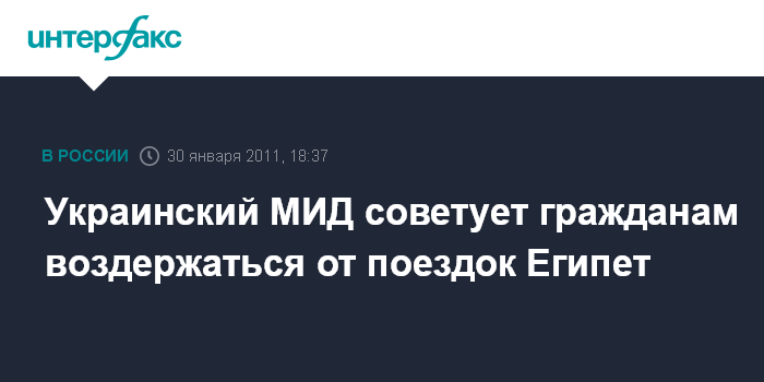 Киев. 30 января. INTERFAX.RU - МИД Украины настоятельно рекомендует гражданам воздержаться от поездок в Каир, Александрию и Суэц, а также на курорты Египта до стабилизации ситуации, сообщил агентству "Интерфакс-Украина" в воскресенье пресс-секретарь внешнеполитического ведомства Александр Дикусаров. "Мы также убеждены, что туристические компании, которые предлагают гражданам Украины посетить Египет с туристической целью, должны в обязательном порядке информировать их о нестабильной ситуации в этой стране", - подчеркнул пресс-секретарь МИД.