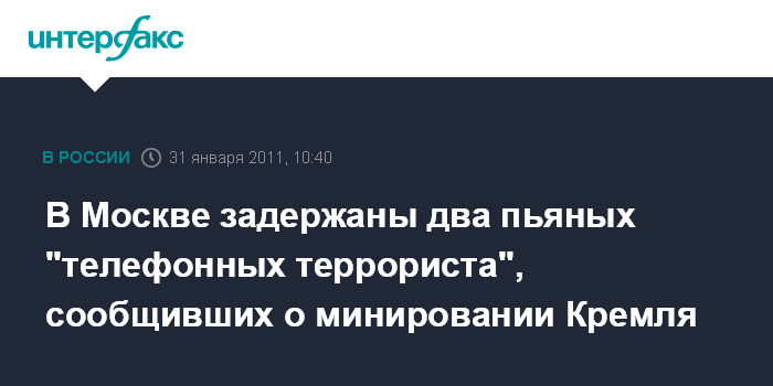 Он добавил, что в тот же день милиционеры задержали еще одного "телефонного террориста", который также сообщил о заложенной в Кремле бомбе. "В данном случае был задержан 55-летний москвич, который также в момент звонка был сильно пьян", - сказал собеседник "Интерфакса".