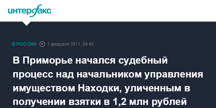 Владивосток. 1 февраля. ИНТЕРФАКС-ДАЛЬНИЙ ВОСТОК - В городском суде Находки началось выездное заседание Приморского краевого суда по обвинению начальника Управления имуществом администрации Находкинского городского округа Владимира Иванова в получении взятки в крупном размере (п. "г" ч. 4 ст. 290 УК РФ).