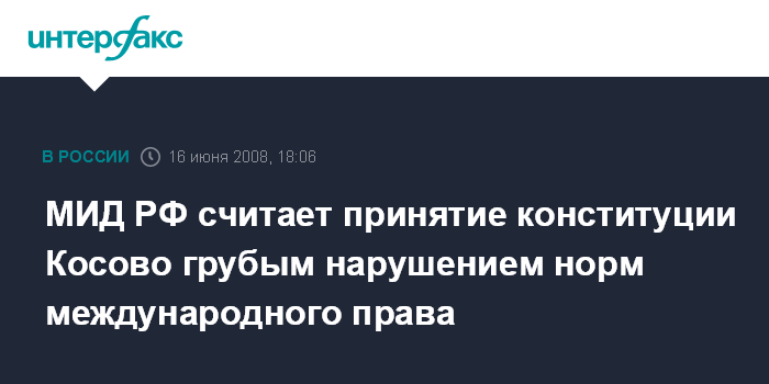 Москва. 16 июня. INTERFAX.RU - Тот факт, что конституция Косово вчера, 15 июня, вступила в силу, является грубым нарушением решений Совета безопасности ООН и международного права, считают в МИД России.
