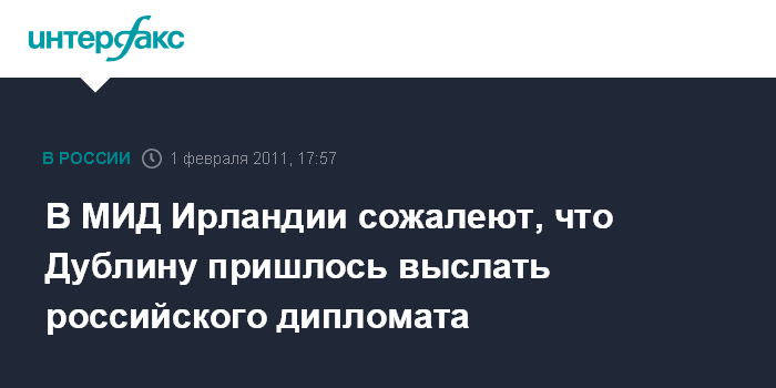 Москва/Дублин. 1 февраля. INTERFAX.RU - Дублин рассчитывает, что высылка российского дипломата не осложнит отношения с РФ.