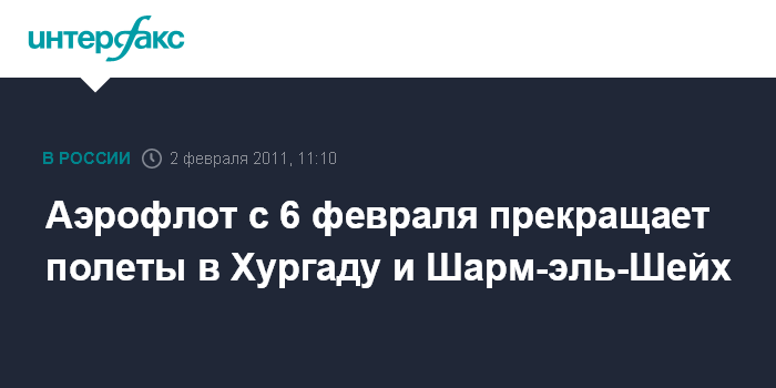 Москва. 2 февраля. INTERFAX.RU - ОАО "Аэрофлот - российские авиалинии" в соответствии с рекомендацией МИД РФ прекратило продажи авиабилетов на рейсы в Хургаду и Шарм-эль-Шейх, говорится в сообщении авиакомпании
