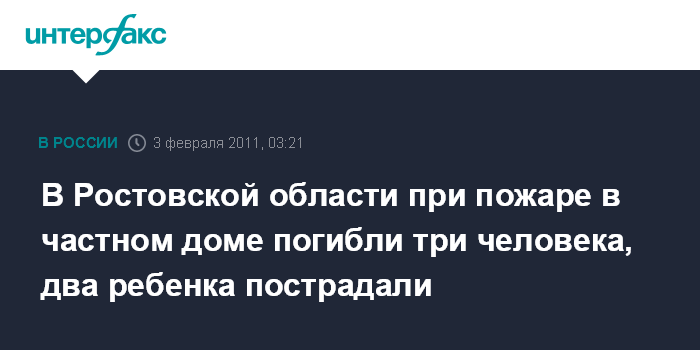 "Сообщение о пожаре поступило на пульт дежурного около 23:00 среды. Площадь пожара составила 35 кв. метров. В настоящее время пожарные вынесли из дома трупы трех человек – двух взрослых и ребенка", - сообщила в четверг агентству "Интерфакс-Юг" официальный представитель ГУ МЧС по Ростовской области Марина Чернявская.