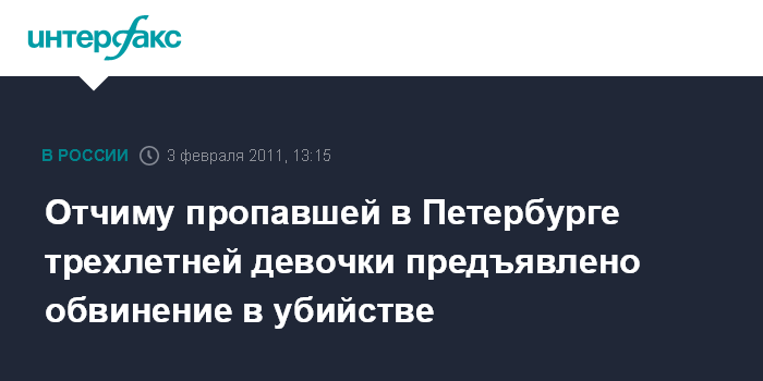 Санкт-Петербург. 3 февраля. INTERFAX.RU - Главное следственное управление СКР по Петербургу предъявило обвинение в убийстве отчиму трехлетней девочки, заявившему о ее пропаже, сообщает сайт ведомства в четверг.
