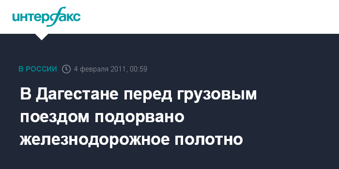 Ростов-на-Дону. 4 февраля. ИНТЕРФАКС-ЮГ - Самодельное взрывное устройство сработало перед идущим грузовым составом на железнодорожном перегоне в Кизлярском районе в Дагестане, сообщили агентству "Интерфакс-Юг" в Кизлярском РОВД.