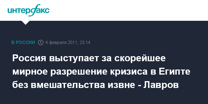 Мюнхен. 4 февраля. ИНТЕРФАКС - Глава МИД России Сергей Лавров рассчитывает, что кризис в Египте завершится мирным путем в ближайшее время без внешнего вмешательства.