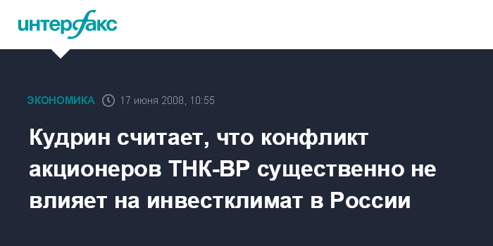 Москва. 17 июня. INTERFAX.RU - Конфликт акционеров ТНК-ВР существенно не влияет на инвестклимат в России, считает виц-премьер, министр финансов Алексей Кудрин. Я думаю, что это частный случай и пока он существенно не влияет (на инвестиционный климат в России - прим. ИФ-АФИ)", - сказал он журналистам сегодня.