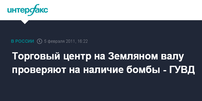 Москва. 5 февраля. INTERFAX.RU - В ГУВД Москвы подтвердили, что в дежурную часть позвонил неизвестный, который сообщил о том, что на территории торгового центра на Земляном валу находится взрывное устройство. На место выехали сотрудники правоохранительных органов, кинологи с собаками, которые ведут поиск возможного взрывного устройства, сказал "Интерфаксу" в субботу дежурный офицер группы оперативно-информационного реагирования столичного ГУВД. По его словам, эвакуация посетителей центра не проводилась.