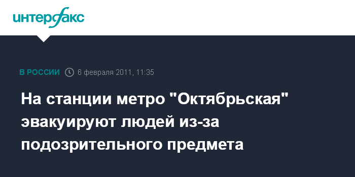 Москва. 6 февраля. INTERFAX.RU - Подозрительный предмет обнаружен на радиальной станции метро "Октябрьская", проводится эвакуация пассажиров, сообщил "Интерфаксу" источник в правоохранительных органах в воскресенье. По его словам, в воскресенье утром на платформе был обнаружен подозрительный предмет. "На место происшествия прибыли саперы, которые должны изучить содержимое находки", - отметил собеседник агентства.