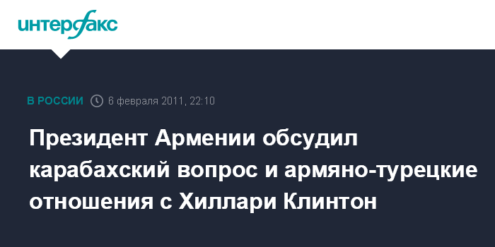 Ереван. 6 февраля. ИНТЕРФАКС - Президент Армении Серж Саргсян и государственный секретарь США Хиллари Клинтон обсудили на встрече в Мюнхене вопросы карабахского урегулирования и армяно-турецких отношений.