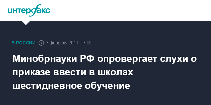 Москва. 7 февраля. INTERFAX.RU - Министерство образования и науки РФ не издавало каких-либо распоряжений, связанных с введением обязательного обучения школьников по субботам.