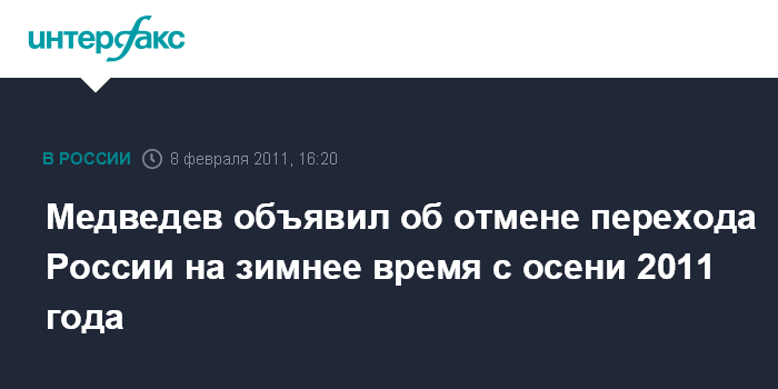 Москва. 8 февраля. INTERFAX.RU - Президент РФ Дмитрий Медведев заявил, что принял решение с осени 2011 года отменить переход на зимнее время, в связи с чем дал соответствующее поручение правительству России.