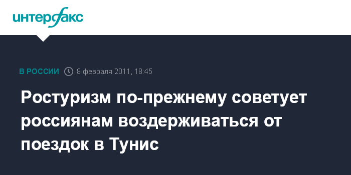 Москва. 8 февраля. INTERFAX.RU - Рекомендация россиянам воздержаться от поездок в Тунис остается в силе, сообщил пресс-секретарь Федерального агентства по туризму (Ростуризм) Олег Мосеев во вторник.