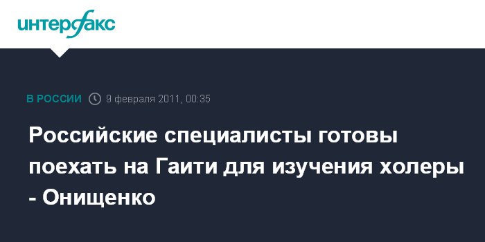 Москва. 9 февраля. ИНТЕРФАКС - Российская санитарная служба готова направить своих специалистов в составе международной группы экспертов на Гаити, где продолжается вспышка опасного заболевания - холеры.