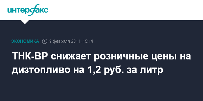 Москва. 9 февраля. INTERFAX.RU - ТНК-BP с 21:00 мск 9 февраля снижает розничные цены на зимнее дизельное топливо на 1,2 рубля за литр, говорится в сообщении компании.