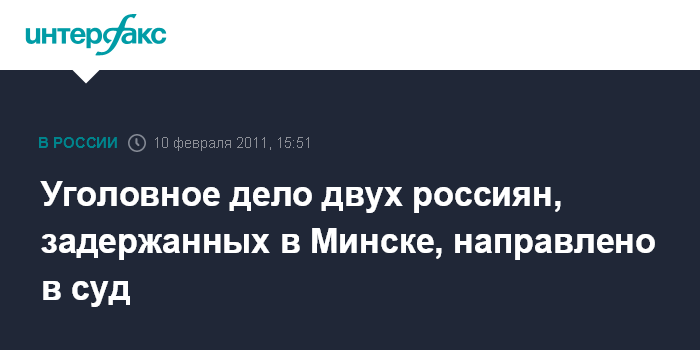 Минск. 10 февраля. INTERFAX.RU - Уголовное дело в отношении двух россиян Артема Бреуса и Ивана Гапонова, задержанных в Минске, направлено в Минский городской суд для определения территориальной подсудности, сообщил агентству "Интерфакс" в четверг старший помощник прокурора белорусской столицы Сергей Балашев.