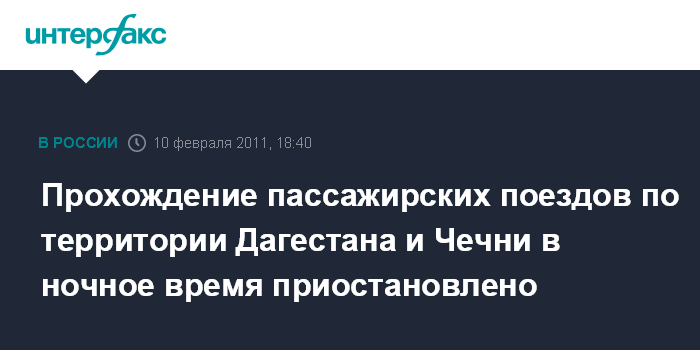 Махачкала. 10 февраля. INTERFAX.RU - Решением руководства ОАО "Российские железные дороги" с 9 февраля приостановлено движение пассажирских поездов по территории Дагестана и Чеченской республики с 18:00 до 06:00, сообщили "Интерфаксу" в Едином информационно-сервисном центре РЖД в Ростове-на-Дону.
