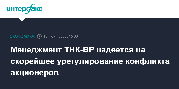 Москва. 17 июня. INTERFAX.RU - Менеджмент ТНК-ВР надеется на скорейшее урегулирование конфликта акционеров, заявил вице-президент по финансам Тим Саммерс на конференции "Россия: во власти преобразования", организованной ИК "Ренессанс Капитал".