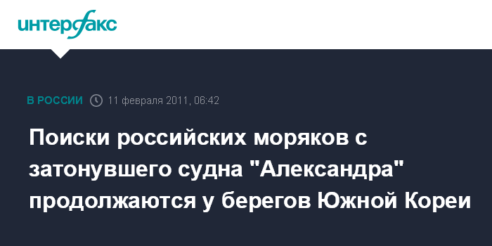 Владивосток. 11 февраля. ИНТЕРФАКС-ДАЛЬНИЙ ВОСТОК - Патрульные суда береговой охраны Южной Кореи продолжают поиск семи пропавших российских моряков с судна "Александра", часть которого затонула после столкновения с более крупным теплоходом.