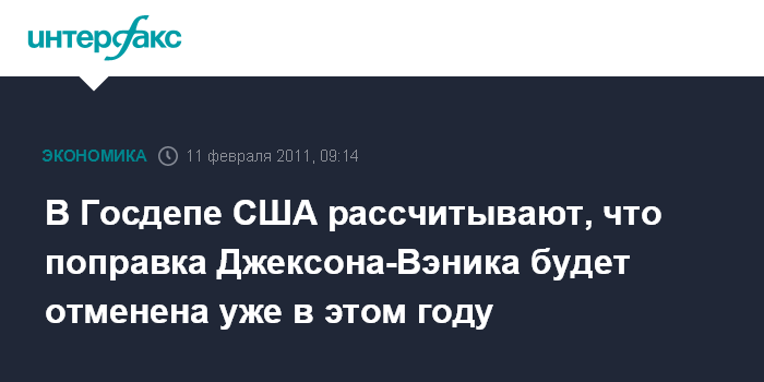 Москва. 11 февраля. INTERFAX.RU - В госдепе рассчитывают, что поправка Джексона-Вэника будет отменена в США уже в этом году.