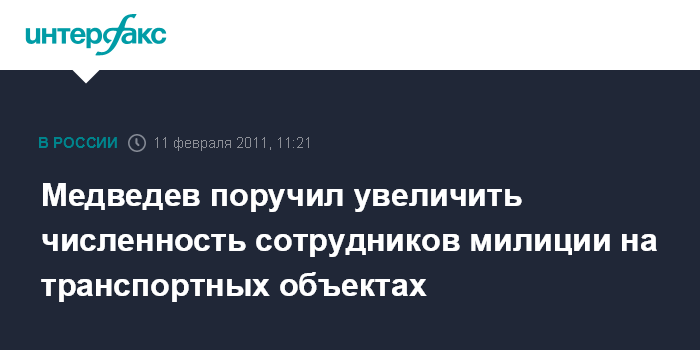 Москва. 11 февраля. INTERFAX.RU - Президент России Дмитрий Медведев поручил главе МВД пересмотреть организацию работы милиции на транспортных объектах и увеличить численность дежурящих сотрудников.