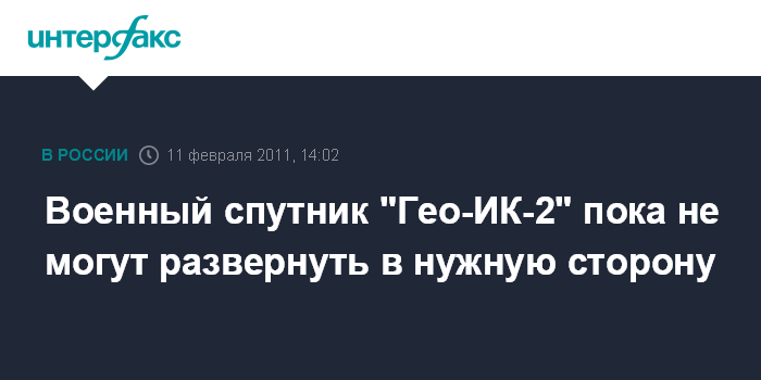 Москва. 11 февраля. INTERFAX.RU - Геодезический космический аппарат военного назначения "Гео-ИК-2", выведенный 1 февраля на нерасчетную орбиту, до сих пор не ориентирован в сторону Земли, что мешает начать его летные испытания даже в имеющихся ограниченных возможностях.