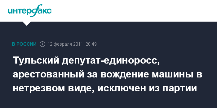 Тульский депутат-единоросс, арестованный за вождение машины в нетрезвом виде, исключен из партии