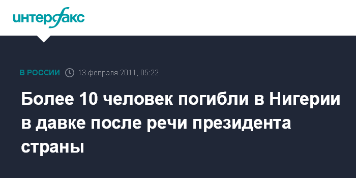 Лондон. 13 февраля. ИНТЕРФАКС - По меньшей мере 11 человек погибли в результате давки на стадионе в южном нигерийском городе Порт-Харкорт, где состоялось предвыборное выступление президента страны Гудлака Джонатана.