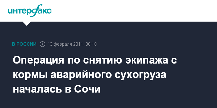 Сочи. 13 февраля. INTERFAX.RU - Сотрудники МЧС России начали спасательную операцию по эвакуации членов экипажа сухогруза, расколовшегося на две части в акватории Сочи. "Спасательная операция по снятию членов экипажа турецкого сухогруза "Бесектаж" началась", - сообщил агентству "Интерфакс-Юг" руководитель управления МЧС РФ в Сочи Николай Шустов.