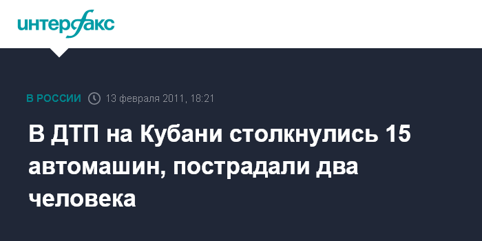 Ростов-на-Дону. 13 февраля. INTERFAX.RU - Пятнадцать автомобилей столкнулись на автотрассе М4 "Дон" в Краснодарском крае, сообщили агентству "Интерфакс-Юг" в правоохранительных органах региона. "ДТП произошло около 17:15 МСК на 1125 км трассы М4 "Дон" в Кущевском районе Краснодарского края. Столкнулись 15 автомашин, пострадали два человека", - сказал представитель правоохранительных органов.