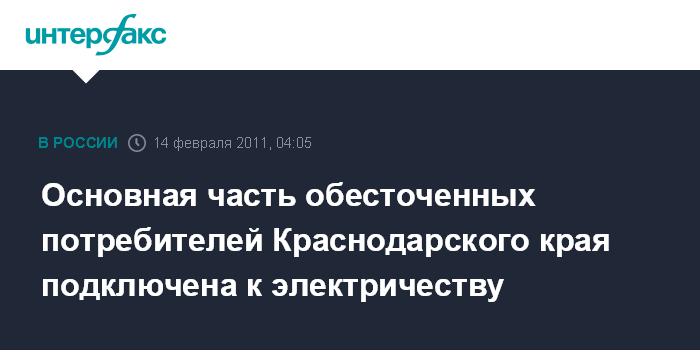 Краснодар. 14 февраля. ИНТЕРФАКС-ЮГ - Количество лишенных электричества жителей Краснодарского края сокращено с 9,7 тыс. до 1,85 тыс. человек, сообщил агентству ‘Интерфакс-Юг‘ представитель пресс-службы ОАО "Кубаньэнерго".