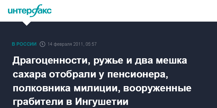 "Примерно в 23:20 мск трое вооруженных людей в масках и в военной форме в Назрани ворвались в частное домовладение, в котором проживает пенсионер, полковник милиции Руслан Кулбужев, и под угрозой применения оружия похитили золотые изделия и драгоценности, ружье и два мешка сахара", - сказал представитель МВД.