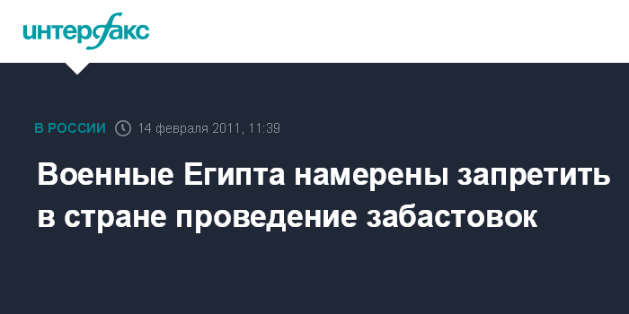 Лондон/Вашингтон. 14 февраля. INTERFAX.RU - Высший военный совет Египта планирует запретить проведение забастовок профсоюзов, рискуя спровоцировать новые народные волнения, сообщает втелеканал Sky News.