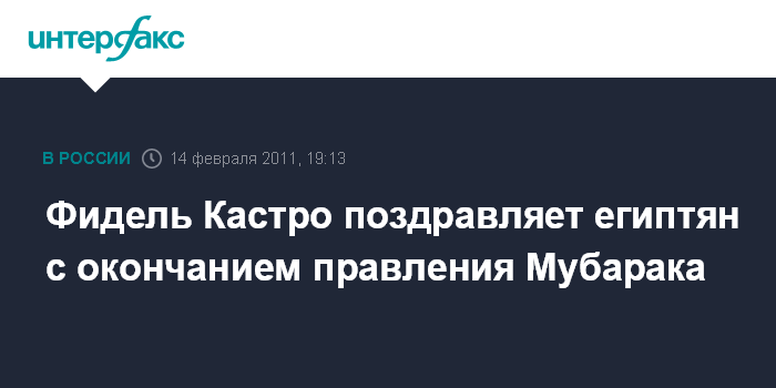 Гавана. 14 февраля. INTERFAX.RU - Бывший кубинский лидер Фидель Кастро выразил в понедельник удовлетворение по поводу отстранения от власти в Египте президента Хосни Мубарака.
