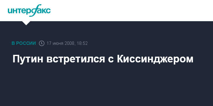 Москва. 17 июня. INTERFAX.RU - Премьер-министр РФ Владимир Путин встретился с бывшим госсекретарем США Генри Киссинджером, сообщила пресс-служба правительства.