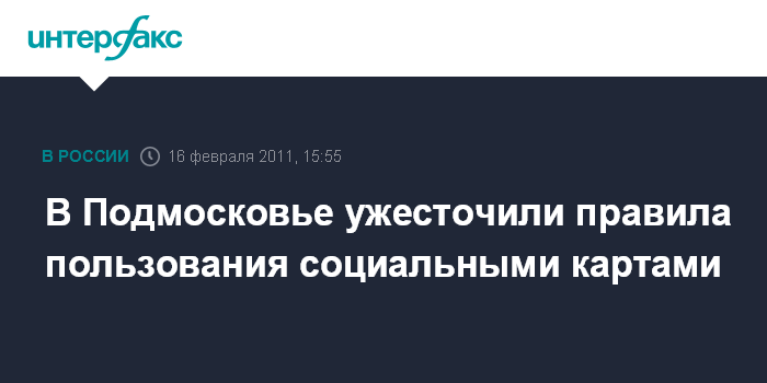 Действие социальных карт жителей Московской области при их неправомерном использовании будет прекращено, заявила на заседании подмосковного правительства в среду министр соцзащиты населения региона Валентина Лагункина. Она пояснила, что внесены изменения в постановление правительства в целях недопущения использования социальных карт жителями Московской области, которые не являются их держателями.