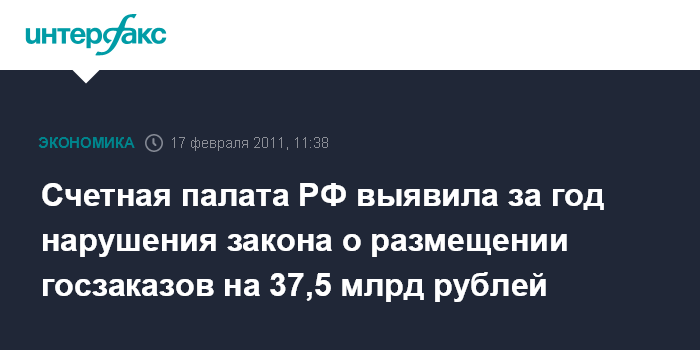 По его словам, Счетной палатой "установлены нарушения закона о размещении госзаказов для государственных и муниципальных нужд на сумму 37,5 млрд рублей".