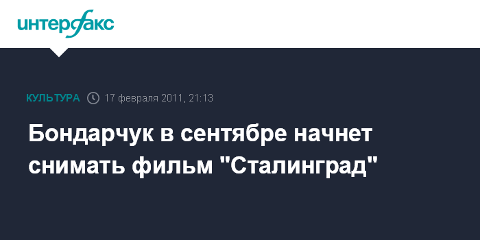 Волгоград. 17 февраля. INTERFAX.RU - Съемки художественного фильма "Сталинград" начнутся в сентябре текущего года, сообщил в четверг на пресс-конференции в Волгограде режиссер картины Федор Бондарчук.