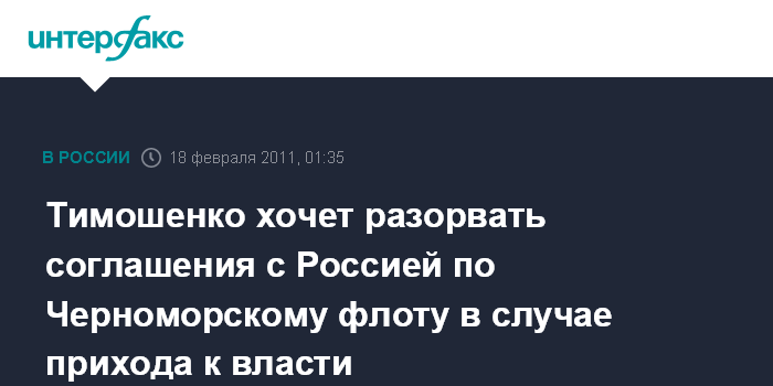Киев. 18 февраля. ИНТЕРФАКС-УКРАИНА - Лидер Всеукраинского объединения "Батькивщина", экс-премьер-министр Украины Юлия Тимошенко заявляет, что после смены нынешней власти в Киеве соглашения о продлении сроков пребывания Черноморского флота РФ в Крыму могут быть денонсированы.