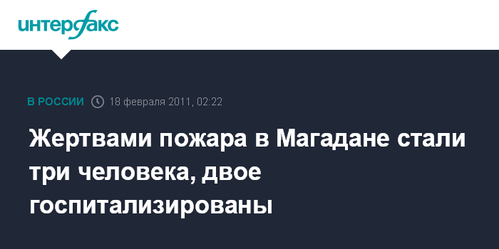 Москва. 18 февраля. ИНТЕРФАКС - Тела трех человек найдены днем в четверг на месте пожара в частном жилом доме на улице Пролетарской в Магадане, сообщает в пятницу пресс-служба ГУ МЧС России по Магаданской области.