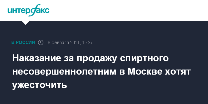 Москва. 18 февраля. INTERFAX.RU - Представители властей и общественности Москвы обсудят нарушения закона о продаже алкоголя несовершеннолетним, итогом обсуждения может стать ужесточение наказания за это правонарушение.