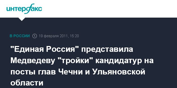 По его словам, на должность главы Чеченской Республики партия предлагает действующего председателя администрации региона Рамзана Кадырова, главу Грозненского муниципального района республики Шаида Жамалдаева и мэра Грозного Муслима Хучиева. На должность губернатора Ульяновской области - действующего главу региона Сергея Морозова, главу муниципального образования "город Ульяновск" Александра Пинкова и аудитора Счетной палаты РФ Сергея Рябухина.